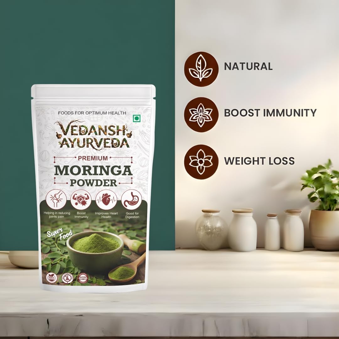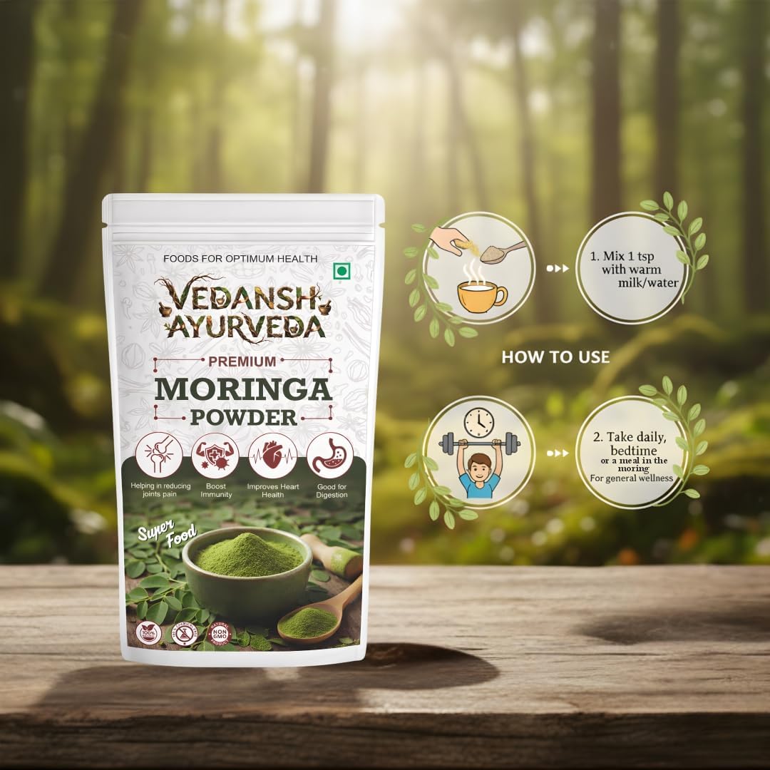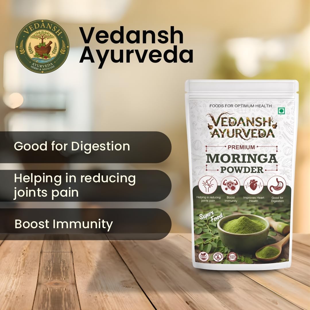 Vedansh Ayurveda Moringa Powder drumstick leaves se bana ek powerful Ayurvedic superfood powder hai jo vitamins, minerals, antioxidants aur plant protein se rich hota hai. Ayurveda me Moringa ko ek complete nutrition herb mana jata hai jo overall health aur wellness support karta hai.